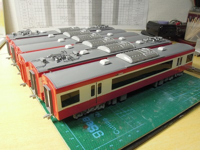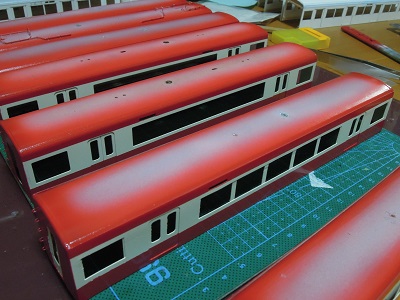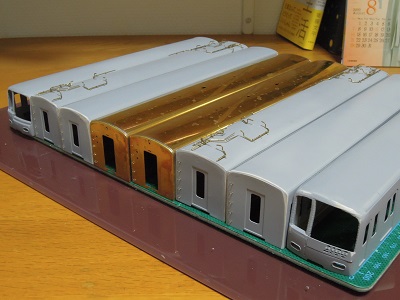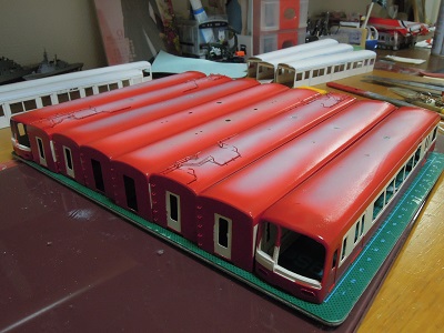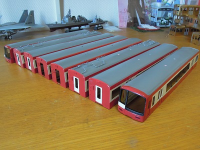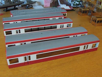 ・車体塗装(2022/9/25) 中間車2種。 KTM製(手前2両)と型紙製(奥4両) |
