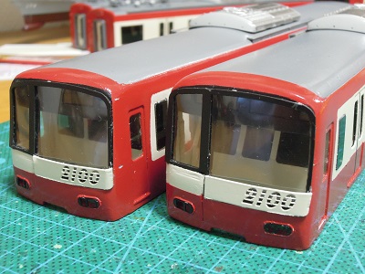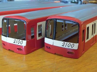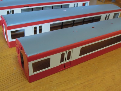 ・車体塗装(2022/9/25) 中間車2種。 KTM製(手前)と型紙製(奥) |