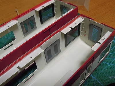 ・車体箱組(2021/10/12) 現状積層の段差が残っています。 窓セルで隠れる部分などを除き、出来る限り段差が 目立たない様に処理します。 |