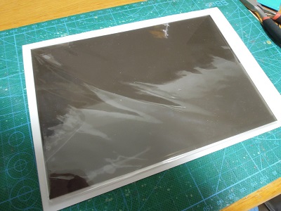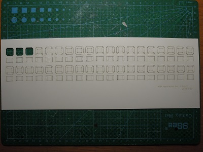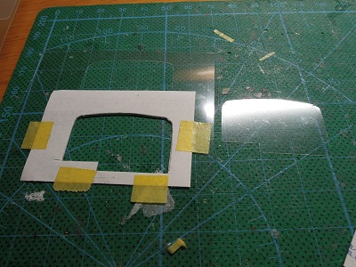 ・車体組立(2023/6/6) 前面窓セルはフィルムシート(恐らくスマホ保護シートの 保護フィルム)を貼り付けます。 窓形状のテンプレートで切り抜きます。 |
