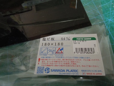 ・車体組立(2023/5/7) 当方もハンズに行ってみると、同じような素材を発見。 厚さといい、色といい、ほぼ同じ。 A様に伺うと、何かの鉄道模型イベントで入手された とのこと。 こういった市販品のカット売りかもしれませんね。 |