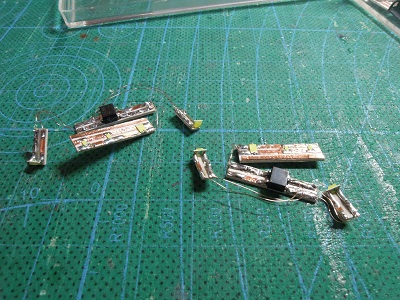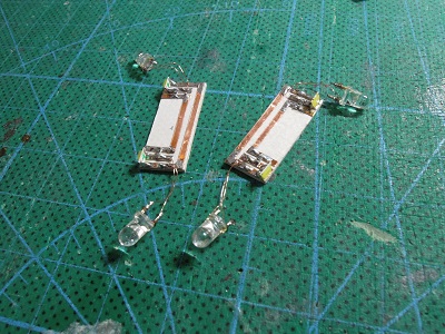 ・車体組立(2023/6/15) 前照灯・表示器のライトユニット。 紙基板にLEDとチップ抵抗を実装しています。 |