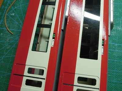・車体組立(2023/3/14) 窓ガラスセルを貼り付けます。 KTM車体は、車端側の窓とドア窓分の窓ガラスセルも 一緒に譲って頂いたので、そのまま貼り付けています。 |