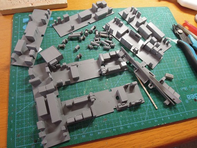 ・車体箱組(2021/10/7) あらかじめ組んでいた車体と、背面の壁を切り取った 前面部と仮組。 左前面から俯瞰。 |