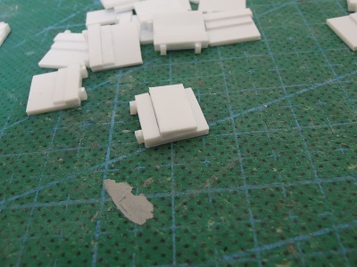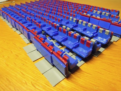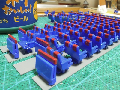 ・車体組立(2023/7/22) マスキングテープで枕カバーを再現します。 塗装したマスキングテープを切出し、1脚ずつ貼り付けて いきます。 なお手前は補助椅子です。 こちらはt-1mmのプラ板から作成しています。 |