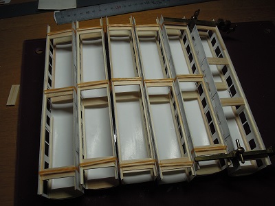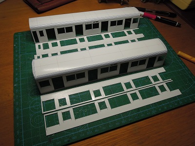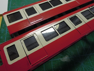 | ・車体組立(2024/5/26) 切出した窓セルをゴム系接着剤で貼ります。 |
