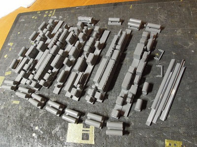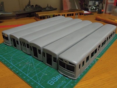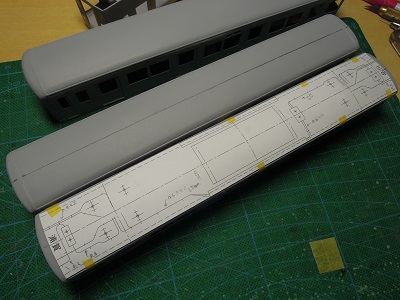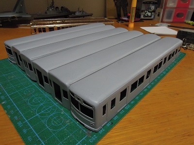| ・車体箱組(2022/9/16) 継ぎ目が平滑になった時点で、#500のサフェを吹いて 車体全体の下地を整えます。 |