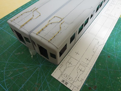| ・車体箱組(2023/10/23) 大分と時間が経過しましたが、屋根上配管に取り 掛かります。 とれいん誌No.517の紙成模型塾の型紙をコピーして、 配管止めの位置決めに使用しています。 |