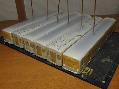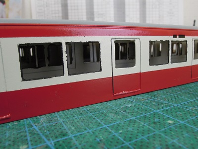 | ・車体箱組(2022/9/1) ドアと窓を抜いていきます。 まずは中間車から。 |