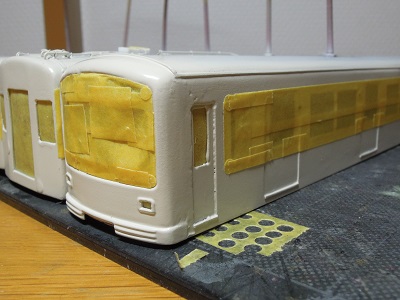 | ・車体塗装(2024/1/1) アイボリー部のマスキング作業中。 塗らない箇所を島状にマスキングテープを貼るのは 苦手だったりします。 |