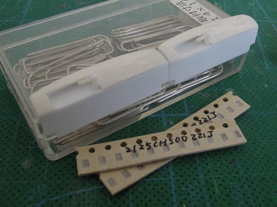 | ・室内灯ユニット組立(2024/4/14) 室内灯ユニットを作成します。 画用紙の上に1.5mm幅に切った銅テープを貼り付けます。 今回も+12Vを一旦+5Vに電圧降下させ、LEDは+5Vで光らせる ようにしました。 これは、今回ちらつき防止のため、LEDと並列にチップ コンデンサを配置していますが、電圧が低いほど同サイズの 部品でも容量が確保できることから、+5Vにしています。 |