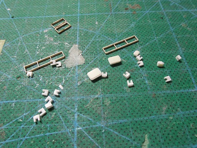 | ・車体組立(2024/6/27) 床下機器類に着手します。 パーツ構成としては、箱を組み、そこに機器表面を筋彫り したパーツを貼る構成です。 | |