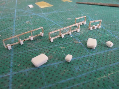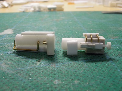 | ・屋根上機器組立(2023/12/5) 床板塗装に合わせて、屋根上機器も塗装します。 そのため、パーツ類の組立。 今回ヒューズボックス周りの配管は、最近のキット付属の パーツと同じように、ヒューズ側から出してみました。 |