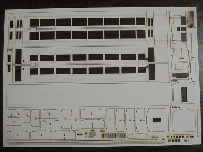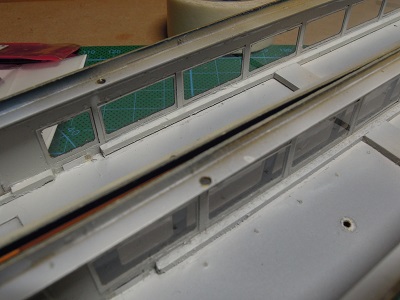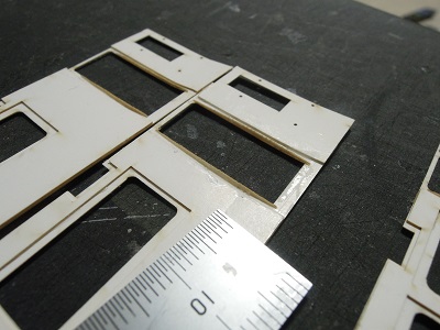 | ・車体組立(2017/8/9) 窓セルの貼り付け。 定番のt=0.2mm透明プラ板を切出して接着しています。 |