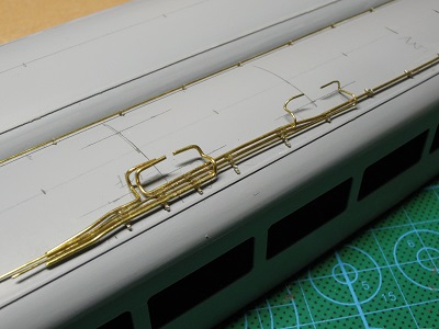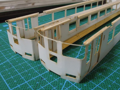 | ・車体箱組(2017/7/9) 手摺類も真鍮線を曲げて植えこみます。 |