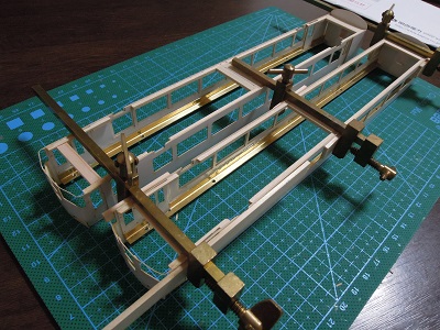 | ・車体箱組(2017/3/9) 肩部に枕木方向の補強材を接着。 ハタガネで接着剤が固着するまで固定します。 |
