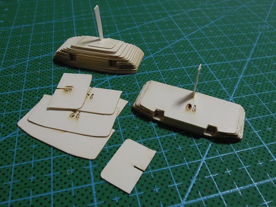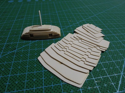 | ・車体箱組(2017/3/9) 前面おでこ部は積層構造です。 構成パーツを切出し、順番に貼り付けていきます。 |