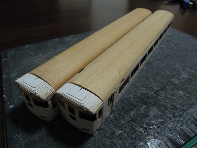 | ・車体箱組(2017/3/3) 妻面はウも手紙と裏紙を貼り合わせ。 前面は事前に後退角を付けておきます。 |