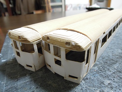 | ・車体箱組(2017/3/13) 木屋根と積層おでこパーツを接着します。 |