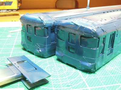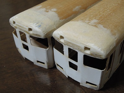 | ・車体箱組(2017/3/15) 平滑処理中。 前面窓上の細い枠が、寸法的にも強度的にも曲者です。 |