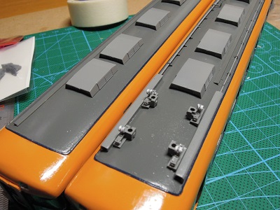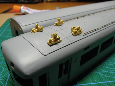 | ・車体組立(2017/8/9) 塗装した屋根上の機器類を取り付けます。 |