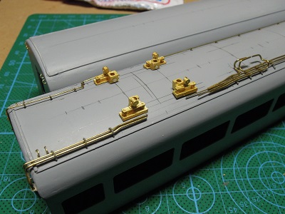 | ・車体箱組(2017/7/7) 12255の屋根上配管。 ヒューズ周辺の俯瞰。 配管が4本平行となるため、配置レイアウト的にも厳しそうに 感じましたので、主配管系はΦ0.5mmの真鍮線を中心に使用 しています。 |