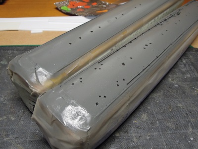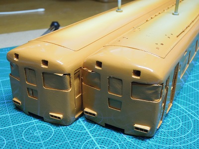 | ・車体箱組(2017/3/18) ある程度継ぎ目が消えたら、#500のサフェを吹いて 下地処理に着手。 |