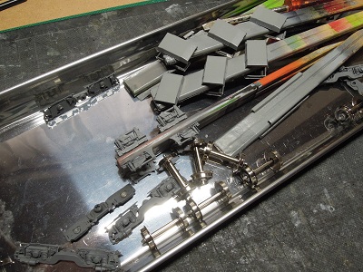 | ・車体組立(2017/8/9) 床板と床下機器類をGM9:ねずみ1号で塗装します。 |