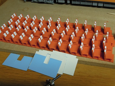 | ・車体組立(2017/8/10) シートはKTMのプラシートを塗装後、マスキングテープを 塗装した枕カバーを貼り付けます。 仕切類は型紙の余った部分から切出したシートを塗装して います。 |
