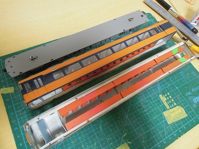 | ・車体塗装(2017/7/17) 車内をマスキングして、車体色のオレンジ塗装に 備えます。 |