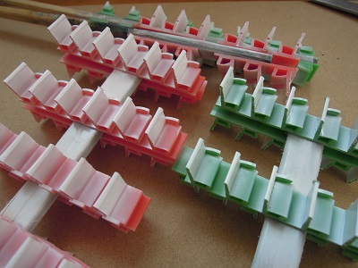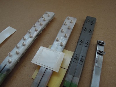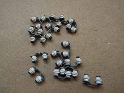 作業の合間に碍子とパンタ台、標識灯ケースを塗装します。 |