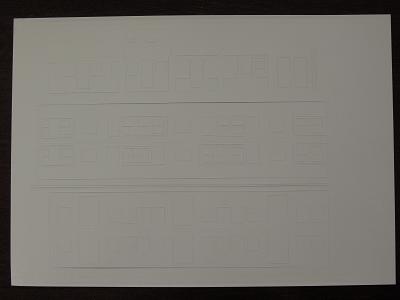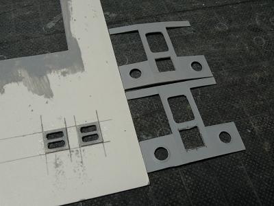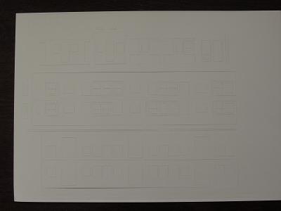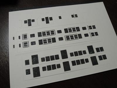 窓抜き作業 ・作業開始。 カッティングマシンでつけてもらった溝をカッターでなぞり、 窓、ドアなどを切り抜いていきます。 |