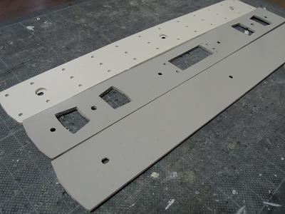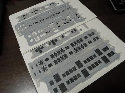 下地処理その1 ・切り抜いたあと、切断面と窓枠補強の為、表板、裏板共に 全体にサーフェイサーを筆塗りします。 |