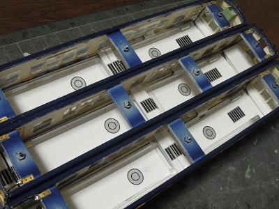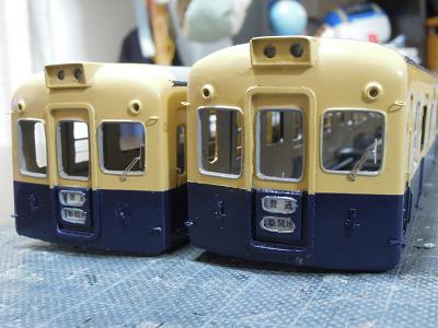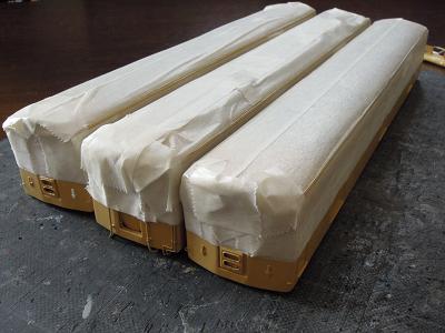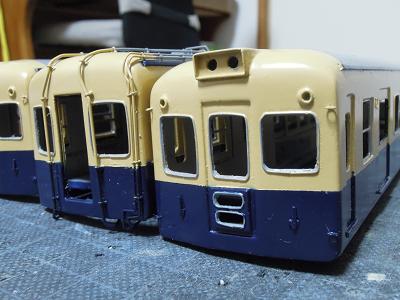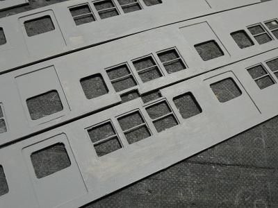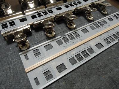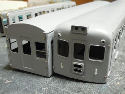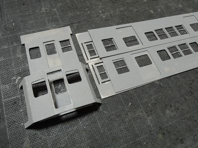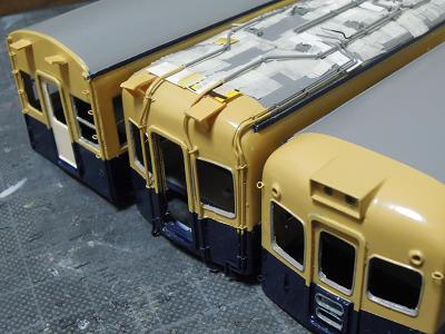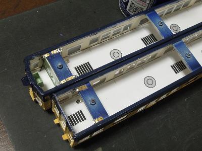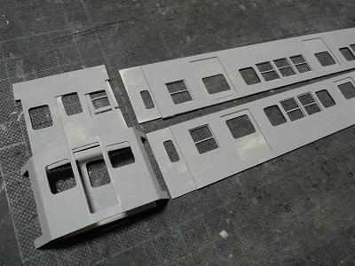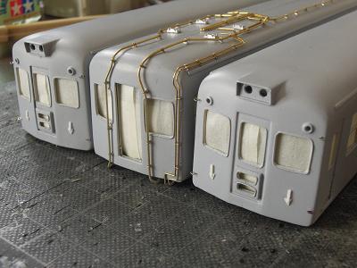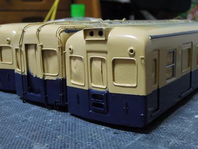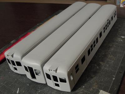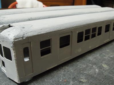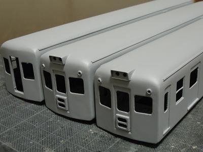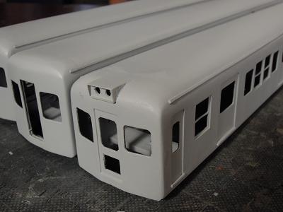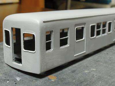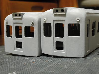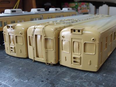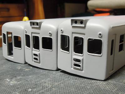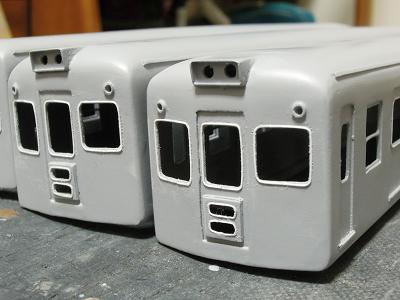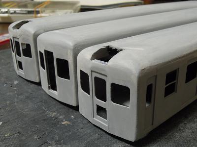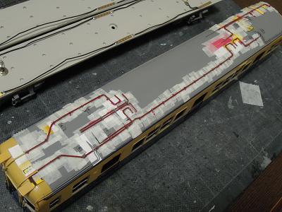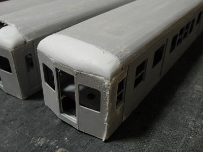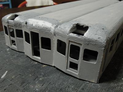 下地処理その1 ・写真は先頭車用。 このあと、全体にサーフェイサー500を吹いておきます。 |