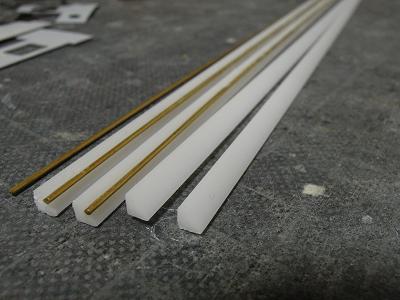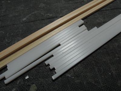 車体箱組み ・車体補強用の木材切り出し。 車体補強のため、角材を切り出します。 天井側は、側面補強材の材質と合わせ、プラ板を、 床板側はt=2mmの角材を使用しています。 なお床板側は、床板固定用のネジを通す為、穴を あけています。 |