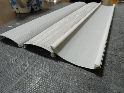 屋根板製作 ・曲げ癖をつけた屋根板を、△材に接着します。 この屋根を車体の補強材に接着する予定です。 |