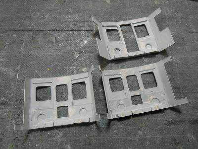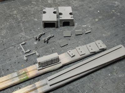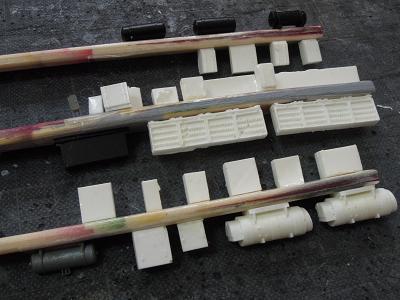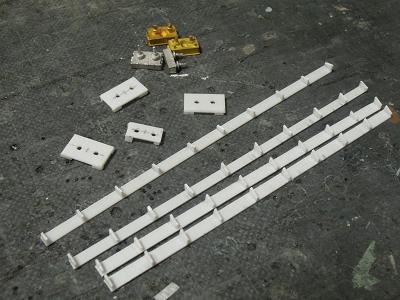 屋根上機器台座類の製作 ・ヒューズ台やパンタ横ランボードをt=0.5mmのプラ板で 作成します。 |