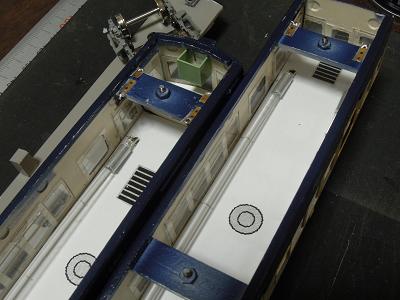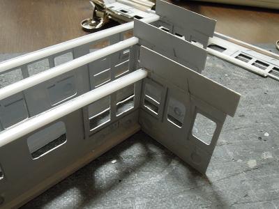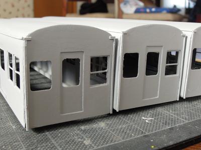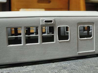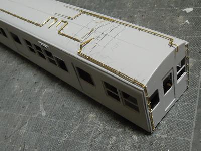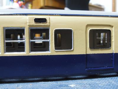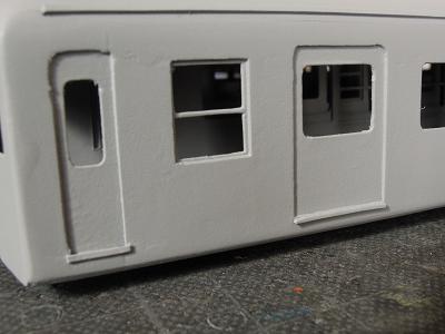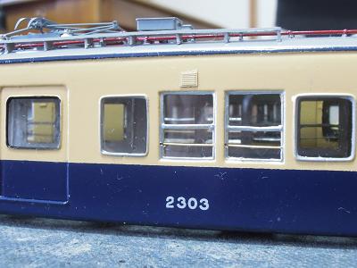 Hゴム表現 ・写真は中間車の2303。 側面も戸袋窓やドア窓にプラ材を接着します。 |
