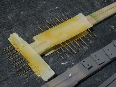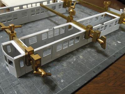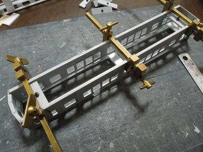 車体箱組み ・天井側補強材の接着。 こちらはゴム系接着剤を使用し、ハタガネで固定して、 約1日放置しています。 |