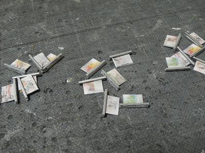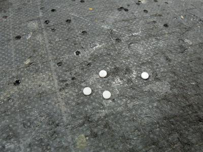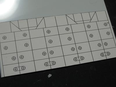 屋根上配管実装 ・配管レイアウトをケガいた後、固定ポイントをφ0.5mmで 穴を開けておきます。 相手が紙なので、この作業は比較的楽です。 |