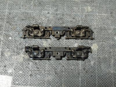 台車加工 ・DT-21のブレーキシューは両抱き方式なので、外側の ブレーキシューを削除します。 上がオリジナル、下がブレーキシュー削除状態。 |