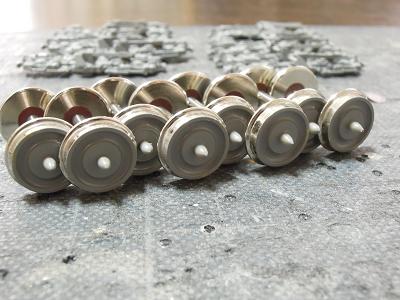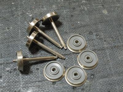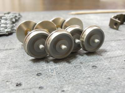 台車組立 ・車輪塗装完了。 写真は動力車用プレーン車輪。 |