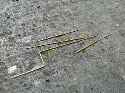 屋根上配管実装 ・パンタグラフ周辺の配管は、外径φ0.6mmのパイプに φ0.4mmの真鍮線を通したものと、外径φ0.5mmの パイプにφ0.3mmの真鍮線を通したものの2種の線材で 表現します。 |
