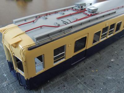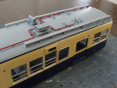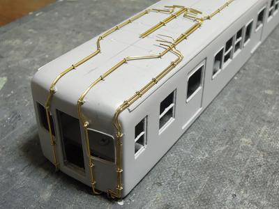 屋根上配管実装 ・写真は姫路寄りパンタグラフ〜妻面。 空気作用管は、ステップの内側を通っているようなので、 妻面ステップ類も同時に実装しています。 |