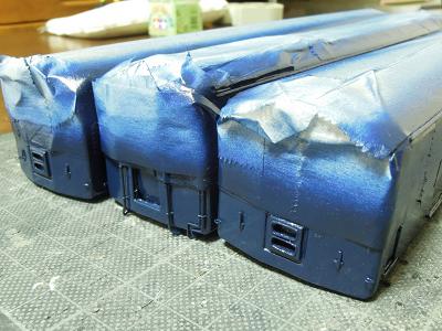 車体塗装 ・ブルーの吹付け完了。 マッハNo.86:山陽電鉄ブルーをGSIクレオスの薄め液で 割って吹付けています。 |
