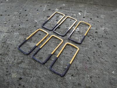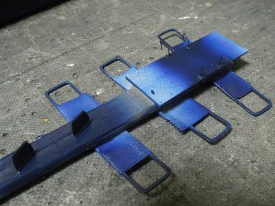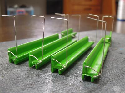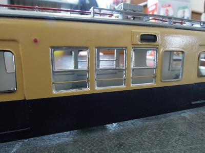 客用窓保護棒の塗装。 ・φ0.3mmの洋白線を切り出し、山陽クリームを吹いて います。 |