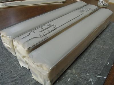 車体塗装 ・クリームの次にブルーを吹きます。 写真はマスキングを施した状態。 |
