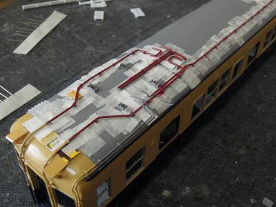 屋根上配管実装 ・先に作成した配管をマッハの配管止めで固定して いきます。 写真は神戸寄りパンタグラフ周辺〜妻面。 運転台撤去跡かつパンタグラフ増設側のため、ある 意味編成中で一番面白い(注目度の高い?)箇所と なります。 |