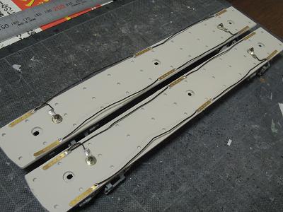 床板組立 ・室内灯用に電気配線を行います。 車体側との接点はシール基板の端子部を利用して います。 これは素材が薄いので、車体梁勘合面の逃げにも 使用しています。 写真はM車2303用床板。 |