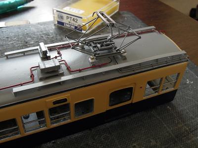 パンタグラフ実装 ・御本尊の実装。 IMONのPT42(平シュー:グレー)を実装します。 写真は神戸寄りパンタグラフ。 |